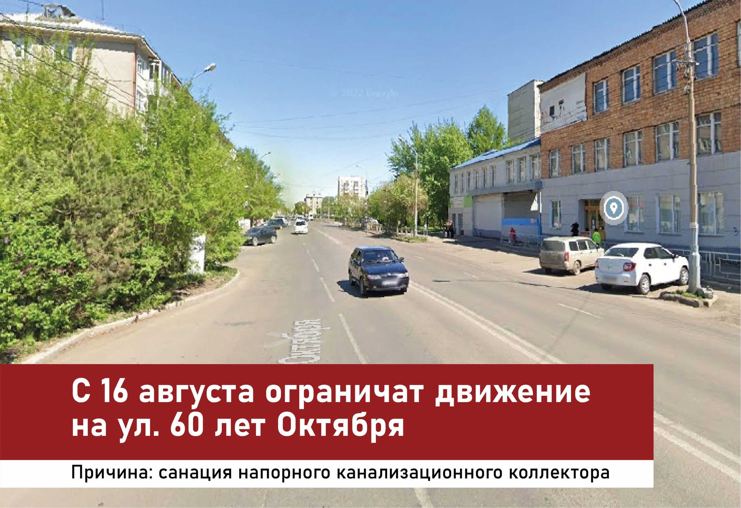 С 16 августа на улице 60 лет Октября в Свердловском районе Красноярска временно ограничат движение. Причина — санация напорного канализационного коллектора.