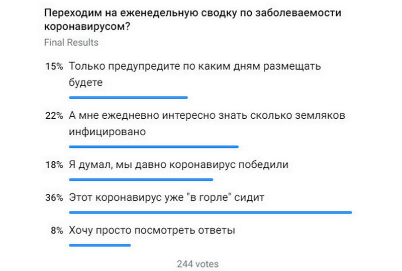 Только 22 % проголосовавших считает, что статистику заболеваемости нужно публиковать по-прежнему каждый день. Большинство же (36 %) ответили, что «Этот коронавирус уже в горле сидит». Отметим, в опросе приняли участие всего 244 человека.