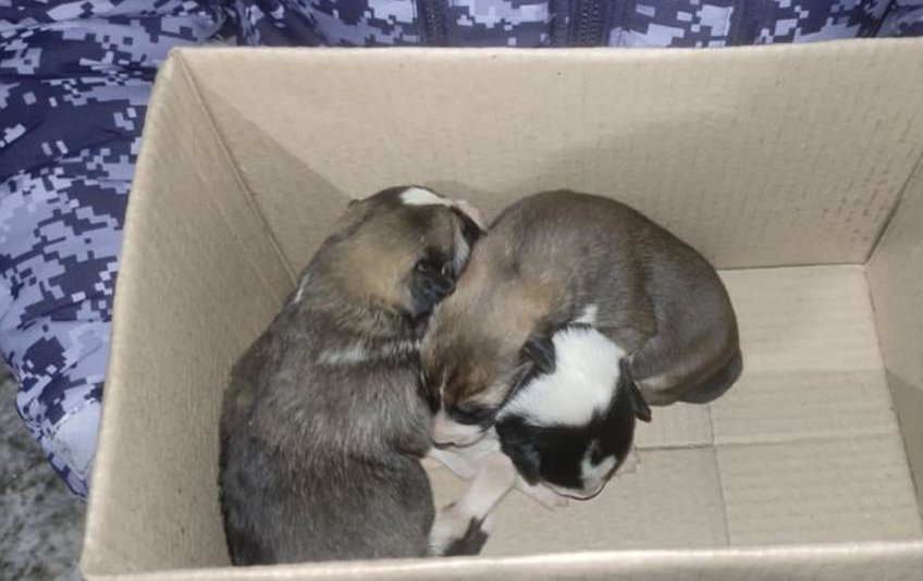 Во время патрулирования города росгвардейцы заметили картонную коробку на улице Грунтовая, подошли к ней и услышали жалобное поскуливание. В коробке сидели четыре щенка.