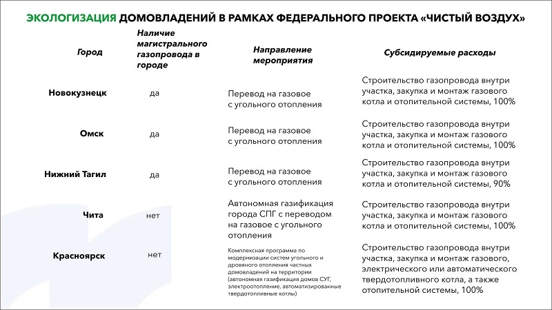 Программы поддержки населения при переходе на экологичные виды топлива запущены также в Омске, Новокузнецке, Красноярске, Нижнем Тагиле.