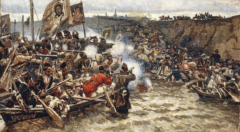 Полотно размером почти 3 м на 6 м, посвященное покорению Сибири, создано Суриковым в 1895 году. Художник работал над ним в течение четырех лет, совершая дальние поездки по местам, связанным с темой картины. Ее сюжет — решающая битва дружины Ермака с многочисленными полчищами хана Кучума в 1582 году.