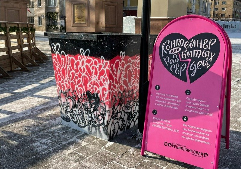 Специалисты «Красноярской рециклинговой компании» («КРК») ко Дню всех влюбленных установили на площади Мира «контейнер для разбитых сердец», куда можно выбросить нелепые подарки, записки и письма от бывших, фотографии, которые вызывают печальные воспоминания о неудачно сложившихся отношениях.