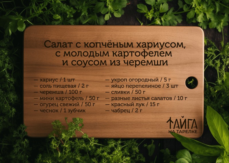 «Этот салат можно назвать летним, дачным, лесным, огородным... Филе копченого хариуса отлично сочетается с молодой картошкой — это простое, вкусное и понятное сибирское блюдо», — говорит Евгений Баранников.