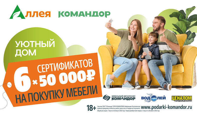 В ходе акции будут разыграны 6 сертификатов на 50 000 рублей компании «Мебельный Командор», 50 сертификатов на 4000 рублей магазинов «Водолей и «Ценалом» и 25 сертификатов на 4000 рублей магазинов компании «Командор».