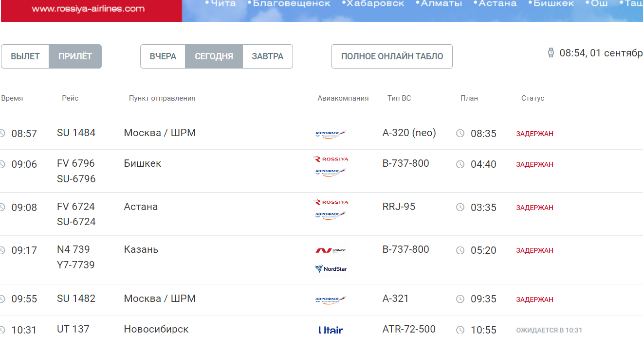 Рейсы задержаны на прилет. Так, не вовремя вылетели самолеты из Москвы (3 рейса), Санкт-Петербурга, Якутска, Бишкека, Астаны и Казани. В общей сложности задержали 8 рейсов.