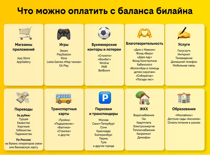 Теперь каталог мобильного приложения билайн содержит более 3000 услуг по всей России. Чтобы оплатить коммунальные платежи, городские парковки, интернет и телевидение, сделать пожертвование, пополнить транспортную карту или перевести деньги за рубеж, не нужно использовать множество различных сервисов. Все это доступно в одном приложении — билайн.