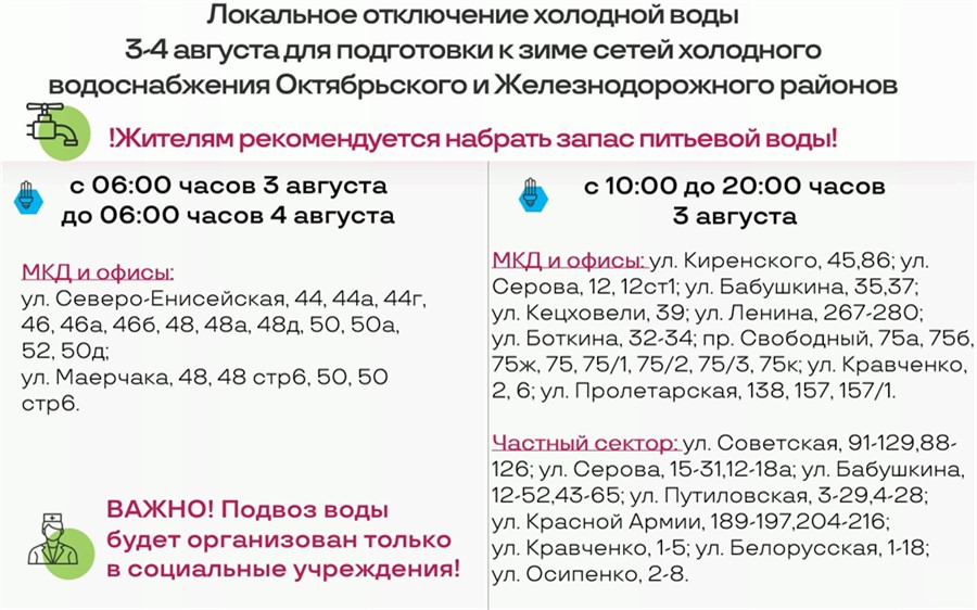 В Железнодорожном и Октябрьском районах Красноярска не будет масштабного отключения холодной воды.