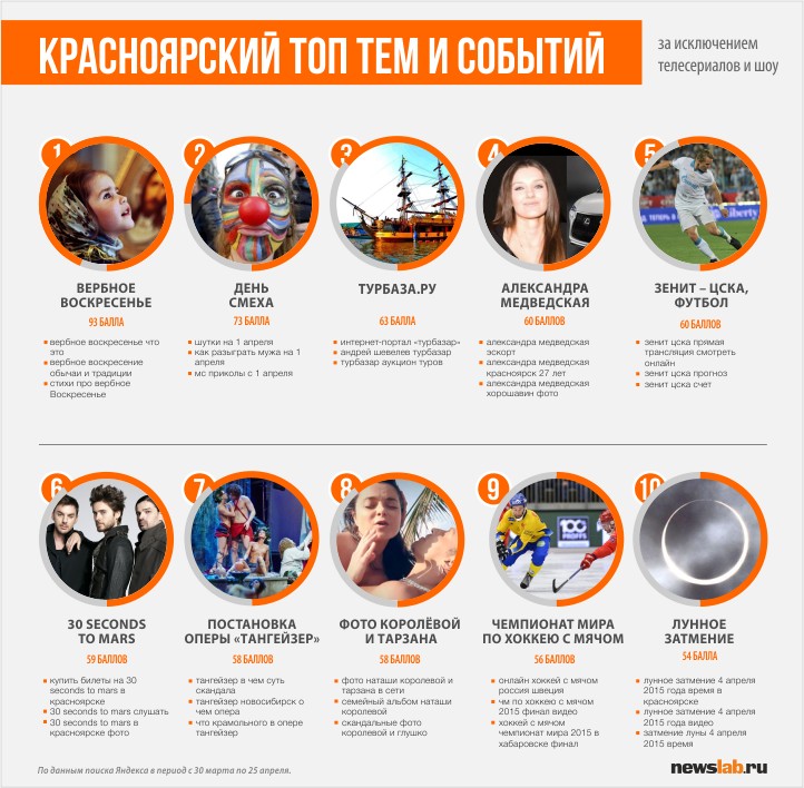 На прошлой неделе красноярцы интересовались православным праздником — Вербным воскресеньем, проектом по продаже дешевых путевок, оцененным самим Путиным, судьбой красноярской модели Александры Медведской, получившей неожиданно щедрый подарок от теперь уже бывшего сахалинского губернатора, концертом группы 30 Seconds to Mars, скандальной оперой «Тангейзер», финалом Чемпионата мира по хоккею с мячом, победу в котором одержала российская сборная, а также лунным затмением.