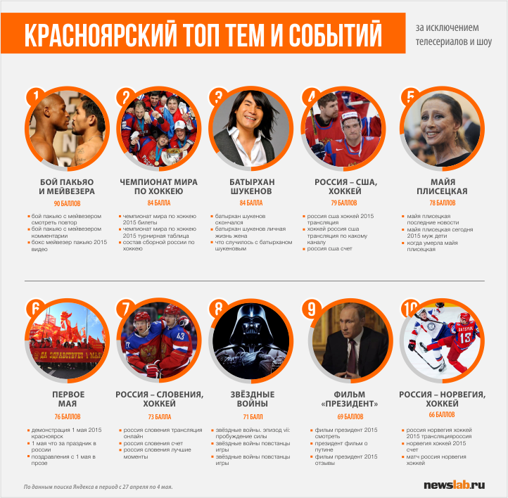 Каждый день в мире происходит много разных событий. Они находят отражение в поисковых запросах пользователей. Яндекс посмотрел на интересы пользователей из Красноярского края с 27 апреля по 4 мая и выделил темы недели, интерес к которым резко вырос по сравнению с предыдущим периодом. Каждая из тем оценена по стобалльной шкале.