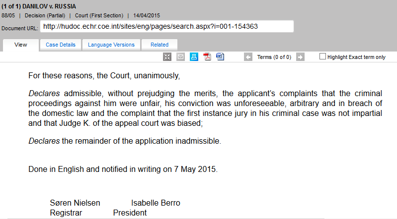 Жалоба была подана в декабре 2004 года, сразу после вынесения приговора, однако к рассмотрению она была приняла только вчера. «Часть жалобы должна быть отклонена как явно необоснованная. При этом суд единогласно объявляет приемлемой, не предрешая по существу вопроса, жалобу заявителя о том, что уголовное дело против него было несправедливым, что его осуждение было непредвиденным, произвольным и нарушало национальное законодательство. Также учтена жалоба о том, что жюри первой инстанции по его уголовному делу не было беспристрастным и что судья апелляционного суда был пристрастен», — отмечается в решении. Эти вопросы и рассмотрит ЕСПЧ. Когда будет рассматриваться жалоба, пока неизвестно.
