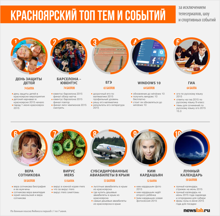 Каждый день в мире происходит много разных событий. Они находят отражение в поисковых запросах пользователей. Яндекс посмотрел на интересы пользователей из Красноярского края с 1 по 7 июня и выделил темы недели, интерес к которым резко вырос по сравнению с предыдущим периодом. Каждая из тем оценена по стобалльной шкале.