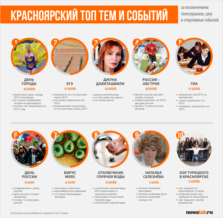 Каждый день в мире происходит много разных событий. Они находят отражение в поисковых запросах пользователей. Яндекс посмотрел на интересы пользователей из Красноярского края с 8 по 14 июня и выделил темы недели, интерес к которым резко вырос по сравнению с предыдущим периодом. Каждая из тем оценена по стобалльной шкале.