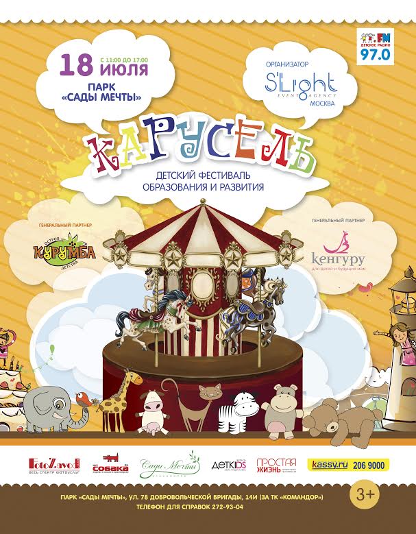 Гостей ждут по адресу ул. 78 Добровольческой Бригады, 14и, с 11 до 17 часов. Стоимость билета — 600 рублей (1 взрослый + ребенок до 12 лет). Дополнительную информацию можно узнать по телефону (391) 272-93-04, а приобрести билеты можно в Городских зрелищных кассах и кассах парка «Сады мечты». Хэштег фестиваля: #карусель24.