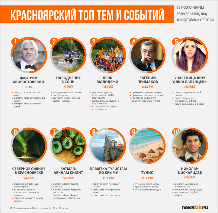 Каждый день в мире происходит много разных событий. Они находят отражение в поисковых запросах пользователей. Яндекс посмотрел на интересы пользователей из Красноярского края с 22 по 28 июня и выделил темы недели, интерес к которым резко вырос по сравнению с предыдущим периодом. Каждая из тем оценена по стобалльной шкале.