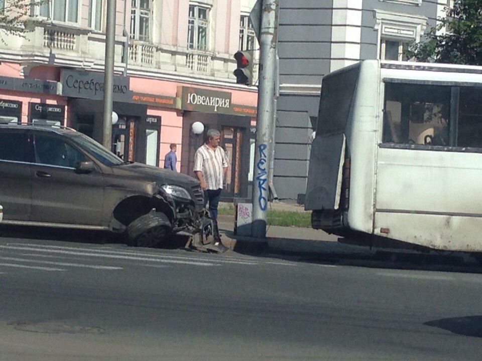 На перекрестке ул. Сурикова и Карла Маркса в Красноярске автобус повредил дорогую иномарку.