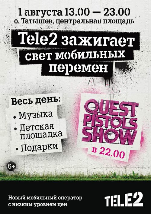 Красноярск — Tele2, альтернативный оператор мобильной связи, 1 августа проведет для красноярцев и гостей столицы края праздник «Tele2 зажигает свет мобильных перемен» (6+). Посетителей ждут развлекательные площадки, уникальное световое шоу и выступление QuestPistols Show.