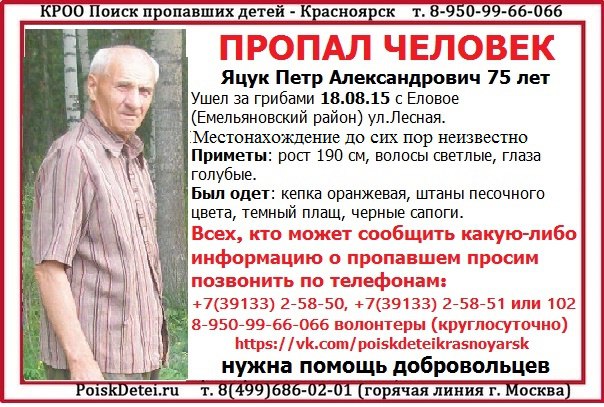 75-летний мужчина ушел за грибами в лесной массив в районе населенного пункта Еловое Емельяновского района еще 18 августа. Его поиски были начаты после того, как сообщение от родственников поступило в полицию и волонтерам организации «Поиск пропавших детей — Красноярск». Несмотря на то, что поиски ведутся все эти дни, найти мужчину пока не удалось. Известно, что у пропавшего есть проблемы с сердцем и случаются обмороки.