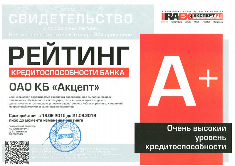 Рейтинговое агентство RAEX (Эксперт РА) в очередной раз подтвердило рейтинг кредитоспособности КБ «Акцепт» на уровне А+ «Очень высокий уровень кредитоспособности», прогноз по рейтингу «стабильный».