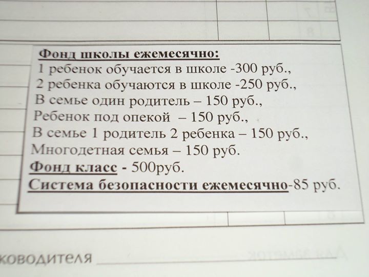 Родители красноярских школьников снова жалуются на поборы в фонд школы и класса. Фотографию с суммами, которые предлагается ежемесячно оплачивать родителям учеников лицея, расположенного на ул. Карбышева, выложил в соцсетях один из родителей. В фонд школы предлагается вносить по 300 рублей, если в ней учится 1 ребенок, либо 250 рублей, если обучение проходят два ребенка. Для льготных категорий сумма снижена до 150 рублей в месяц. Дополнительно к этому предлагается вносить деньги в фонд класса — это еще 500 рублей с ребенка без всяких скидок и 85 рублей за «систему безопасности».