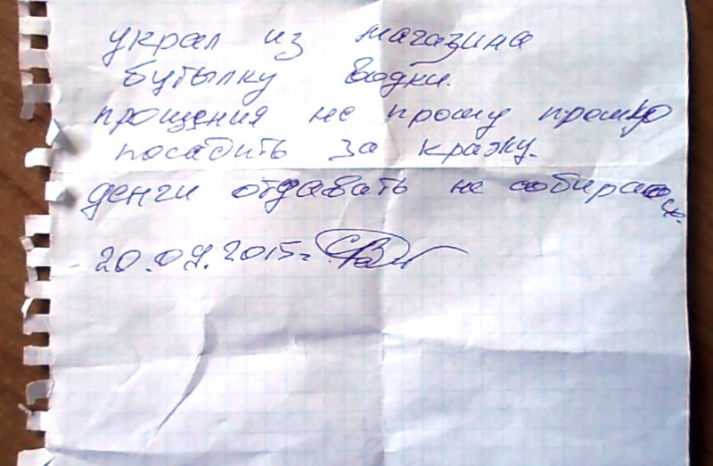 Административным производством и уголовным делом закончились кражи алкоголя в двух торговых точках Канска для 48-летнего мужчины. Жалобу на него подали сотрудники магазинов — они рассказали, что на кассе вместо расчета он подавал записку. В ней содержалось подтверждение факта кражи и отказ от оплаты, а также просьба «посадить». Записка была заверена подписью и датой.