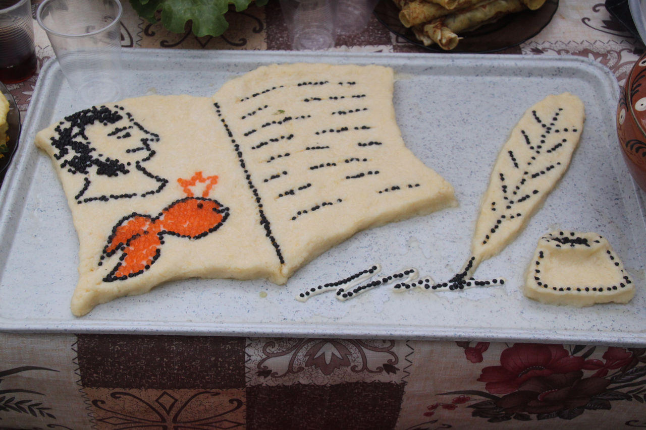 Композиция представляет собой открытую книгу, чернильницу и перо. На одной из страниц книги педагоги выложили портрет Александра Пушкина из чёрной икры и золотую рыбку из красной икры. Также сообщается, что при изготовлении композиции использовался тёртый сыр.