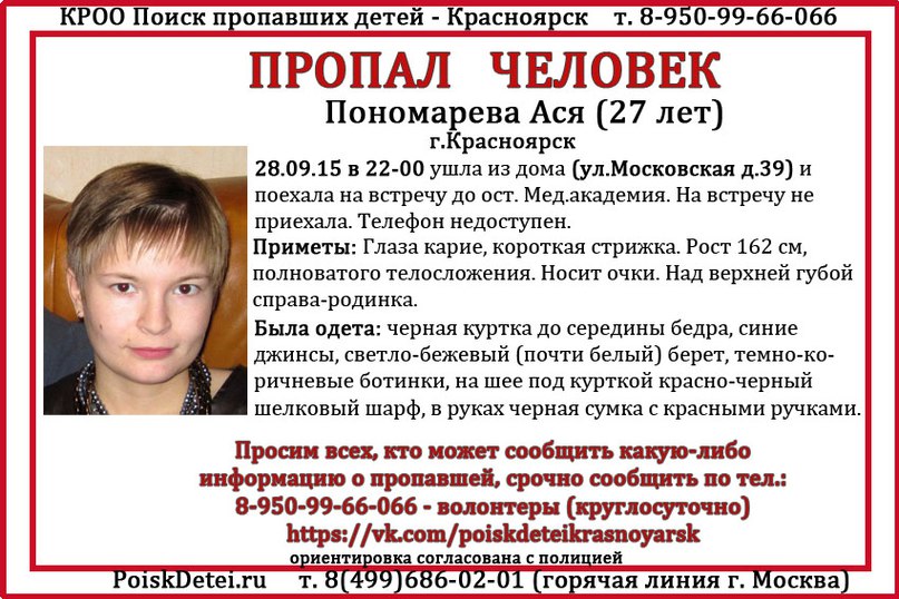 В Красноярске полицейские и добровольцы ищут пропавшую три дня назад девушку. Как рассказали волонтеры организации «Поиска пропавших детей», 28 сентября, около 10 вечера, 27-летняя Ася Пономарева ушла из дома по ул. Московской и пропала.