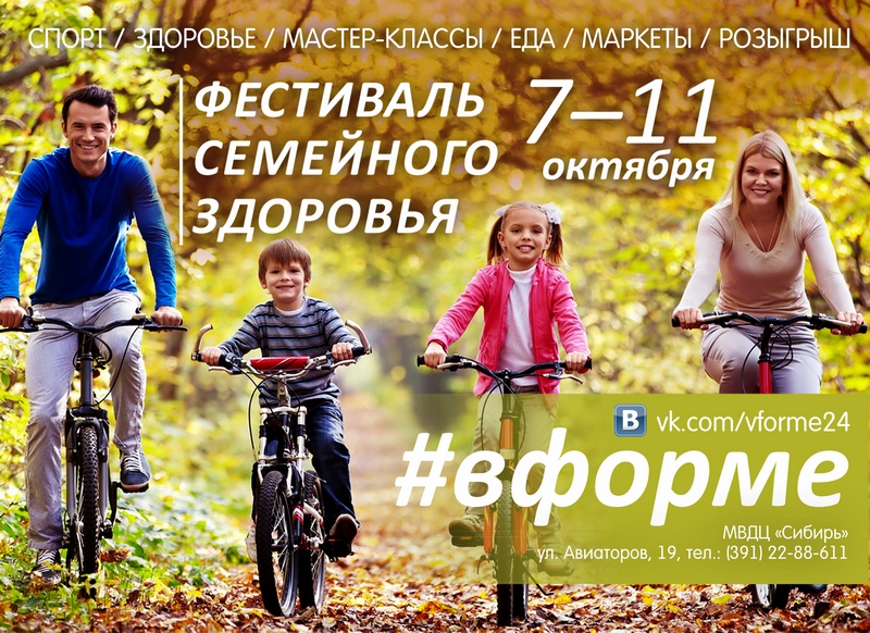 С 7 по 11 октября в красноярском МВДЦ «Сибирь» (ул. Авиаторов, 19) в рамках ежегодной Ярмарки здоровья и народной медицины пройдет интерактивный Фестиваль семейного здоровья #вформе. На нем будет представлено множество методик оздоровления для взрослых и детей.