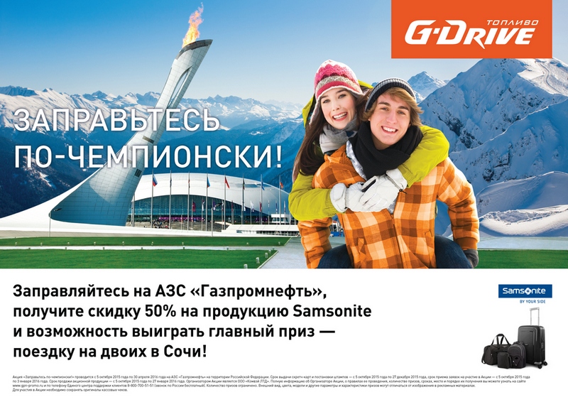 На АЗС сети «Газпромнефть» стартует новая федеральная акция «Заправьтесь по-чемпионски!». С 5 октября по 27 декабря 2015 года автомобилисты получат возможность выиграть одну из шести поездок на двоих в Сочи.