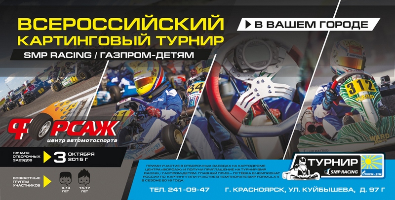 В Красноярске пройдет отборочный этап всероссийского чемпионата по картингу SMP Racing/Газпром детям. Юные гонщики будут соревноваться в трех возрастных категориях: от 9 до 11 лет, от 12 до 14 лет и от 15 до 17 лет. Участие в чемпионате бесплатное. Для этого родителям или опекунам ребенка нужно заполнить анкету, а также предоставить справку о состоянии здоровья участника.