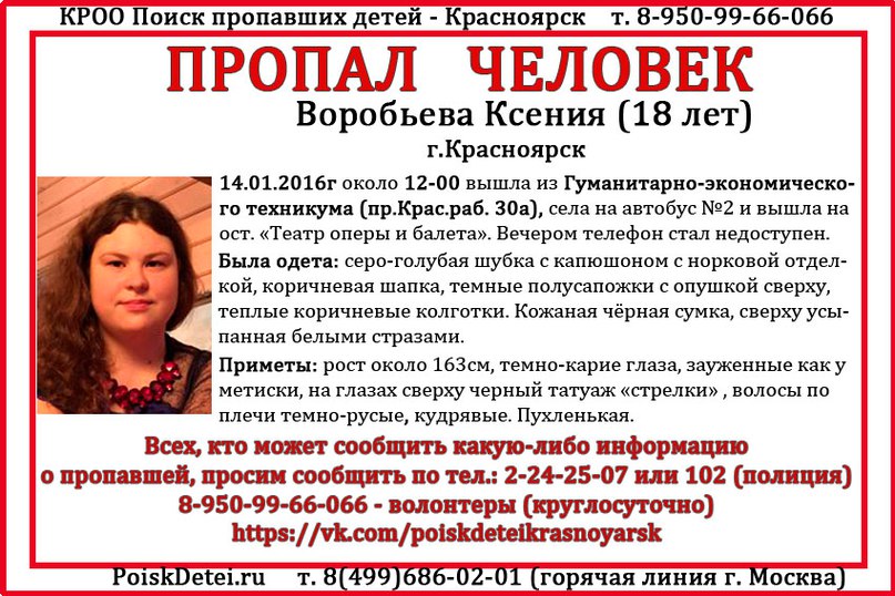 По данным общественников, 14 января Ксения Воробьева вышла из Гуманитарно-экономического техникума, расположенного на пр. имени газеты «Красноярский рабочий», села с подругой в автобус маршрута № 2 и вышла на остановке «Театр оперы и балета» — предположительно, на встречу с молодым человеком. Вечером телефон девушки стал недоступен.