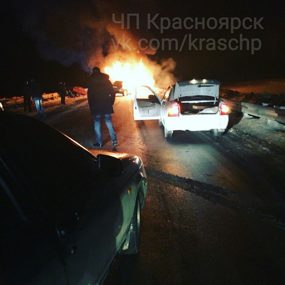 На федеральной трассе М-53 произошло смертельное ДТП. Информация о случившемся появилась в социальной сети — по словам очевидцев, после столкновения обе машины сгорели дотла. Также сообщалось о двух жертвах и нескольких травмированных людях.