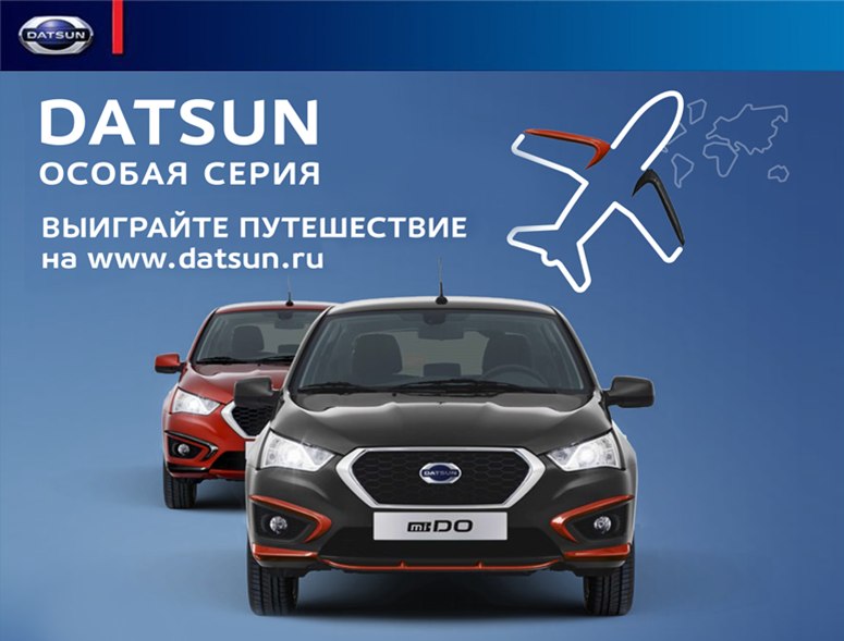 Срок проведения акции — с 1.02 по 30.04.2016. Информация об организаторах акции, правилах ее проведения, количестве призов, подарков или выигрышей, месте, порядке и сроках их получения — на www.datsun.ru. Количество автомобилей ограничено, уточняйте подробности у дилеров.