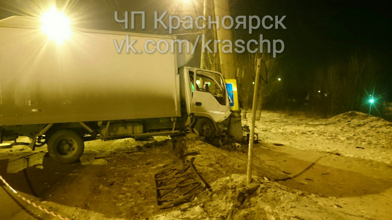 На ул. Калинина в Красноярске грузовик сбил столб, сообщили очевидцы происшествия. Авария произошла вчера вечером на ул. Калинина около дома № 65 — грузовик Isuzu по неизвестной причине выехал на обочину и врезался в опору освещения.