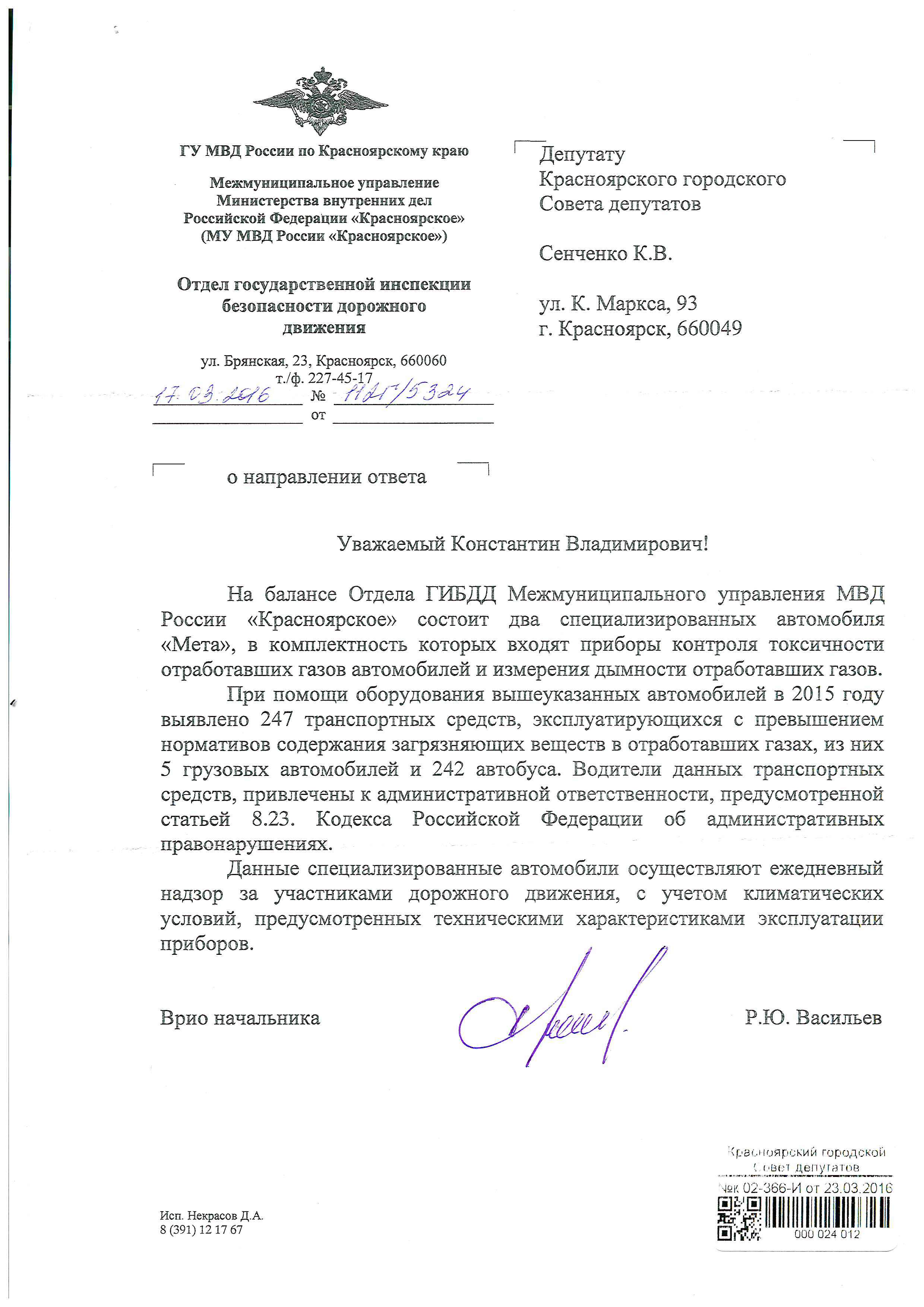 Общественники получили ответ от отдела ГИБДД МУ МВД России «Красноярское» на запрос информации об экологичности общественного транспорта. По данным ОГИБДД, за прошедший 2015 год полицейские при помощи специализированных автомобилей «Мета» выявили 242 автобуса и 5 грузовых автомобилей, в выхлопных газах которых содержится загрязняющих веществ больше разрешенной нормы. Водители привлечены к административной ответственности по ст. 8.23 КоАП, предусматривающей предупреждение или штраф в 500 рублей.