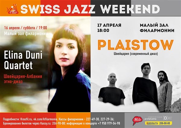Откроется уик-энд швейцарского джаза выступлением квартета певицы Элины Дуни. Квартет, ведомый исполнительницей албанского происхождения, перерабатывает в своём творчестве приёмы и сочинения балканского фольклора, и считается одним из ярчайших коллективов европейского этно-джаза.