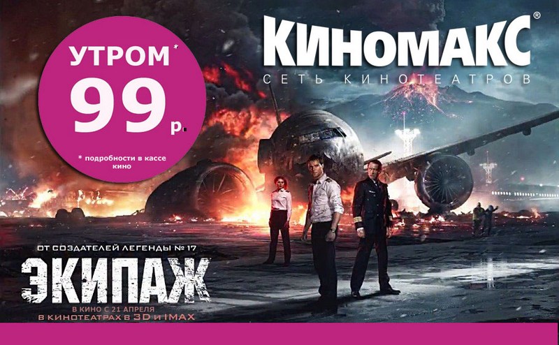 Зрители утренних сеансов — с 10 до 11 часов — смогут посмотреть «Экипаж» в формате 2D и 3D всего за 99 рублей. Подробности акции — у кассиров кинотеатра.