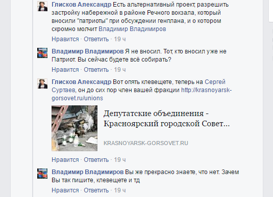 Владимиров написал это вчера в комментариях к посту Аркадия Волкова, где развернулось обсуждение генерального плана Красноярска и новых предложений в него, вынесенных на публичные слушания. Депутат Александр Глисков в ходе дискуссии укорил Владимира Владимирова и его однопартийцев в том, что они вносили сомнительные поправки в генплан, касающиеся, например, застройки Кузнецовского плато и набережной в районе Речного вокзала.