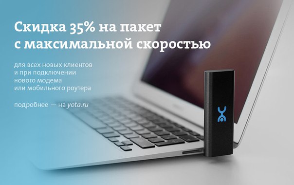 Федеральный мобильный оператор Yota снизил цены на безлимитный 4G-интернет для новых клиентов и при подключении нового устройства. При подключении пакета с максимальной скоростью доступа в сеть для модема или мобильного роутера предоставляется скидка в размере 35 % в течение полугода. В Красноярске стоимость с учетом скидки составит 585 рублей вместо 900 рублей.
