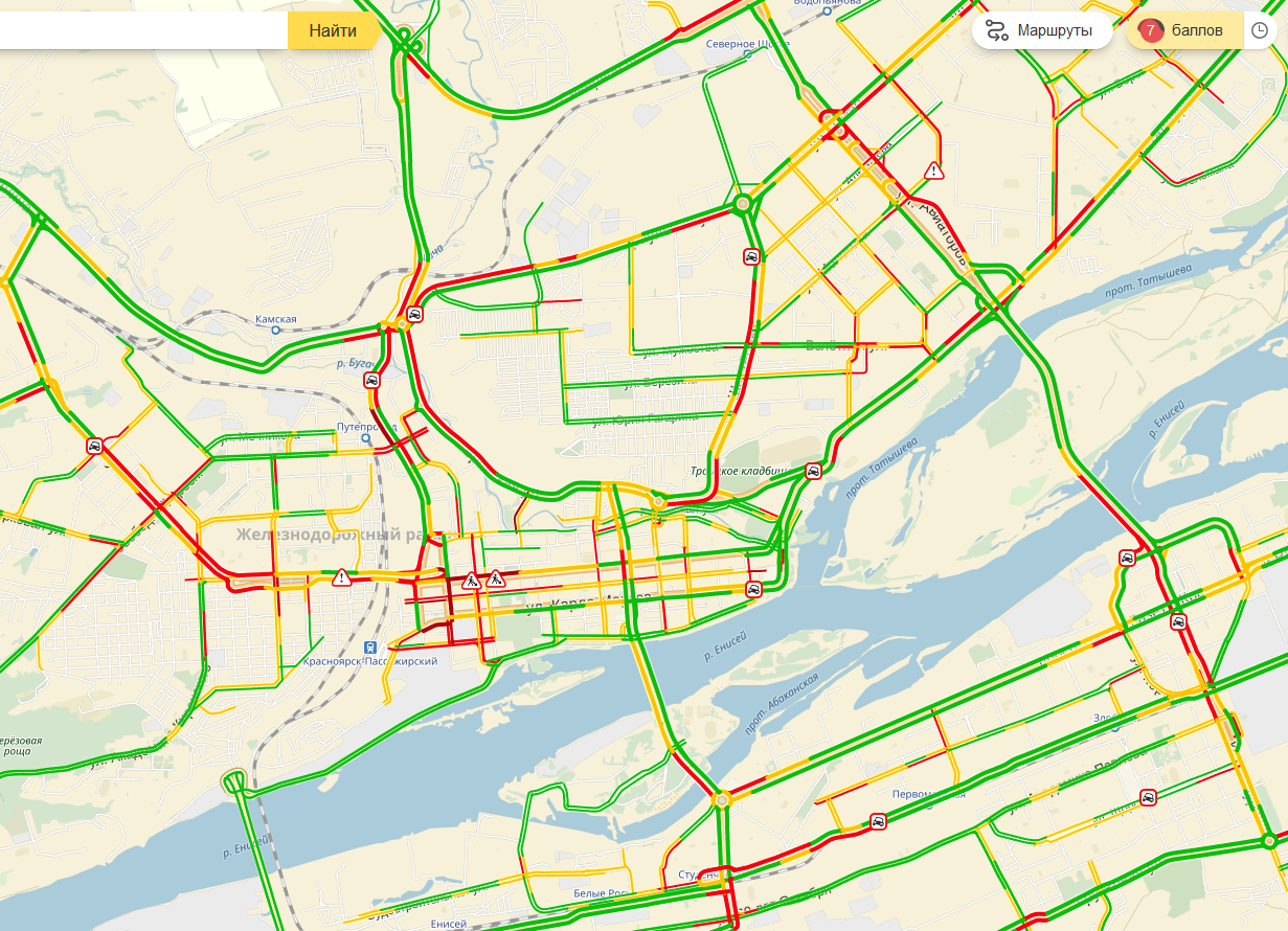 К концу последнего рабочего дня перед 3-дневными выходными в Красноярске образовались 7-бальные пробки. Согласно сервису «Яндекс. Пробки», заторы наблюдаются в основном на левобережье города.