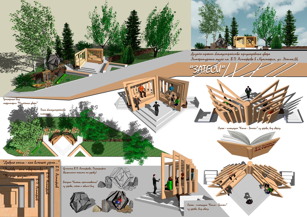 Всего на конкурс было подано 9 работ. В конкурсную комиссию входили красноярские архитекторы Константин Шумов, Владимир Чукреев, Эдуард Панов, Леонид Бабичев. Все они отметили профессиональный уровень и оригинальность конкурсных работ. Идея Анны Колобовой, по мнению жюри, в наибольшей степени соответствует духу и техническим возможностям Литературного музея. Ее проект «Затеси», посвященный одноименному произведению Виктора Астафьева, предполагает сцену в виде открытой книги.