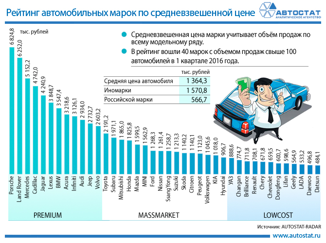 Средняя стоимость иномарки в России превысила 1,5 млн рублей, сообщили в аналитическом агентстве «Автостат» по итогам проведенного исследования средневзвешенных цен на новые легковые автомобили в первом квартале 2016 года.
