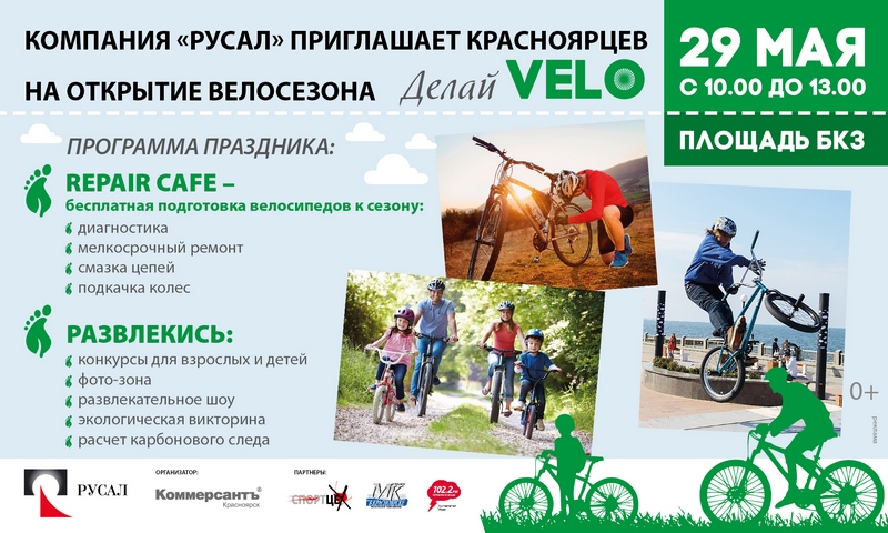 29 мая с 10 часов утра на площади Мира в Красноярске, возле БКЗ, откроется велосезон «Делай Velo» — взрослых и детей ждет бесплатное Repair-кафе, конкурсы, развлечения, подарки.