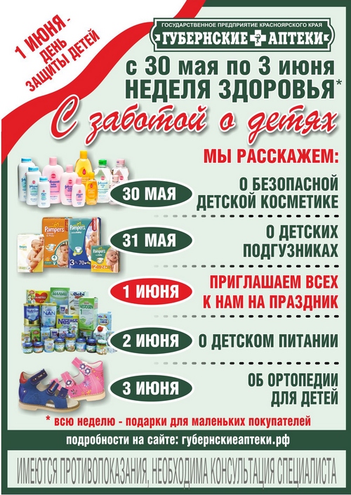 С 30 мая по 3 июня в сети «Губернские аптеки» в Красноярском крае пройдет акция «Неделя здоровья», посвященная международному Дню защиты детей. В течение недели специалисты государственной аптечной сети будут проводить презентации товаров и консультации для молодых мам.