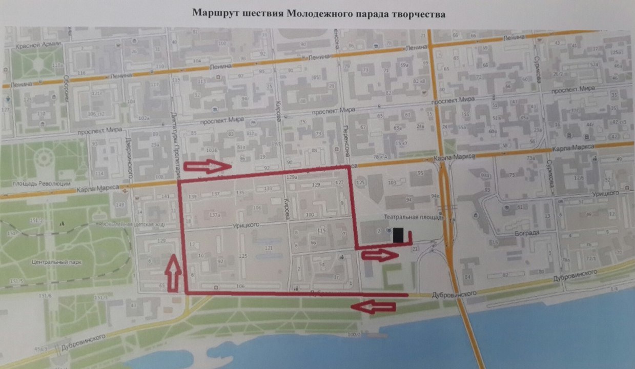 «В этом году новая страница нашего карнавального движения — он будет Молодежным парадом творчества. Мы попробуем в этом году пройти совершенно по другому маршруту — мы стартуем от Речного вокзала, пройдем до улицы Диктатуры Пролетариата, перейдем на улицу Карла Маркса, вновь повернем на улицу Перенсона, и красиво вернемся на Театральную площадь. Все будут яркие, красивые и интересные — творческие коллективы вузов, школ, предприятий, бизнес-структур. Возглавят эту колонну лауреаты премии главы города, золотые и серебряные медалисты школ, и, конечно, мы не могли не принять пожелание молодежных коллективов, приехавших к нам из других стран на фестиваль, — они тоже пройдут в колонне карнавала».