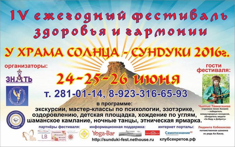 24-26 июня на территории историко-археологического музея-заповедника «Сундуки» в Хакасии пройдет фестиваль здоровья и гармонии «У храма Солнца — Сундуки 2016».