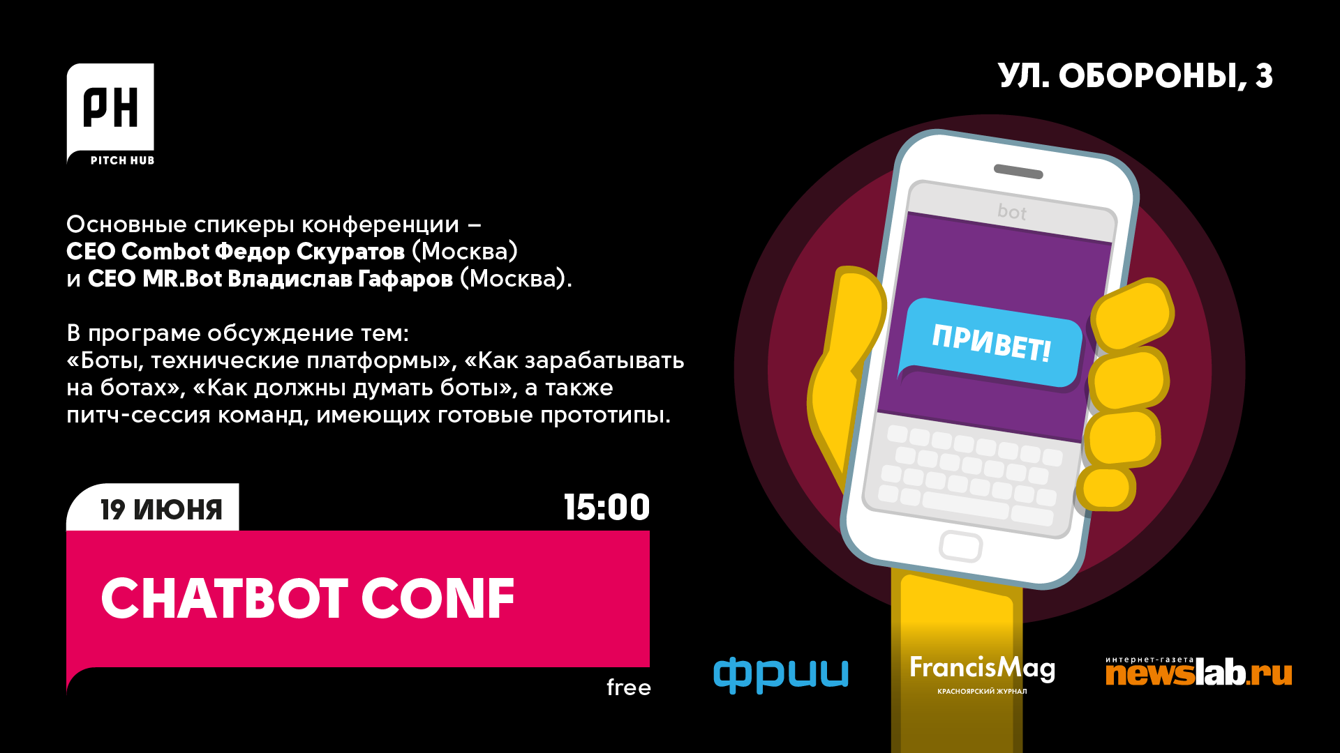 19 июня в лофт-пространстве Pitch Hub в Красноярске (ул. Обороны, 3) состоится первая конференция по чат-ботам. В рамках программы участники разберут технические платформы, специфику проектирования, а также расскажут, как можно заработать на этой технологии.