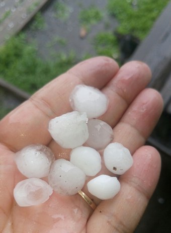 «Вот такой град побил посевы на полях и огородах в Каа-Хемском кожууне. Фото нашего Минсельхоза. Специалистами обследованы посевные площади. Обнаружены поломанные стебли, листья. В местечке „Эшкендер“ пострадал овес и горох. Местные власти ввели ЧС муниципального характера, идет оценка ущерба», — пояснил глава региона.