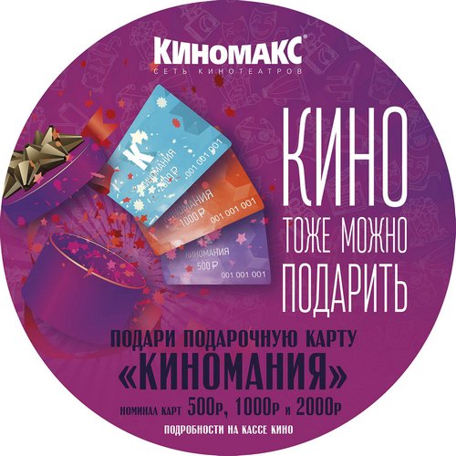 Кинотеатр «Киномакс» представил красноярцам подарочные карты «Киномания» номиналом 500 и 1000 рублей. Карту можно использовать для оплаты билетов кино, в том числе, билетов со скидками, участвующих в акциях и других. При этом карта будет действовать в любом кинотеатре сети www.kinomax.ru, кроме франшизных.
