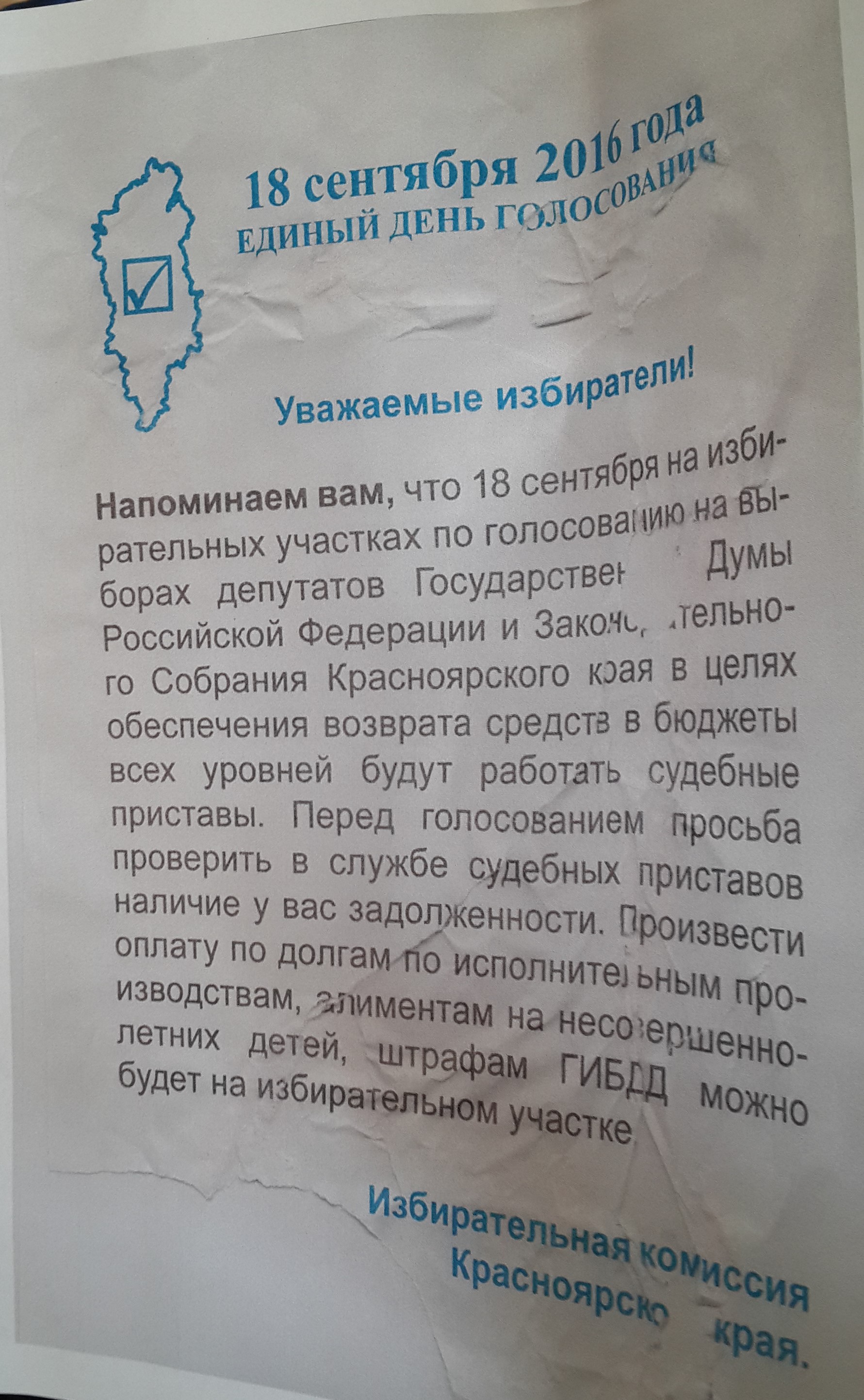 «На территории Красноярского края через СМИ путем разбрасывания листовок начала распространяться лживая информация от якобы Избирательной комиссии Красноярского края о том, что 18 сентября в единый день голосования на избирательных участках будут присутствовать судебные приставы и взыскивать задолженности с наших избирателей. Данная информация является фальшивой, не относящейся к реальной действительности. Я официально заявляю, что никаких судебных приставов на избирательных участках присутствовать не будет. Не верьте фальшивой информации».