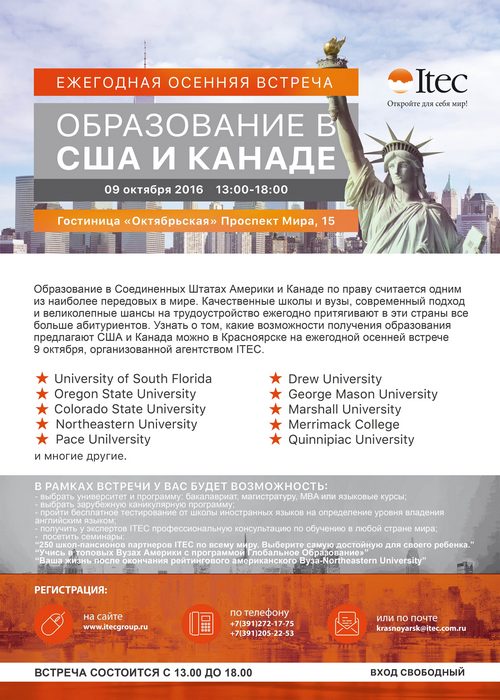 Компания ITEC приглашает старшеклассников и их родителей, студентов и молодых специалистов на ежегодную встречу с представителями американских и канадских вузов и языковых центров. Она пройдет в гостинице «Октябрьская» 9 октября с 13 до 18 часов.